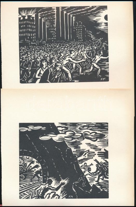 Leírás: Frans Masereel (1889-1972): Jelenetek. 5 db fametszet, papír, jelzett a metszeten, 11×13 cm