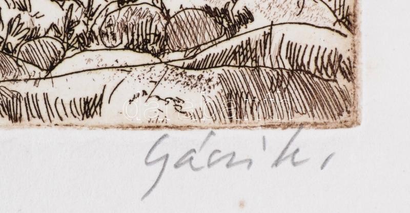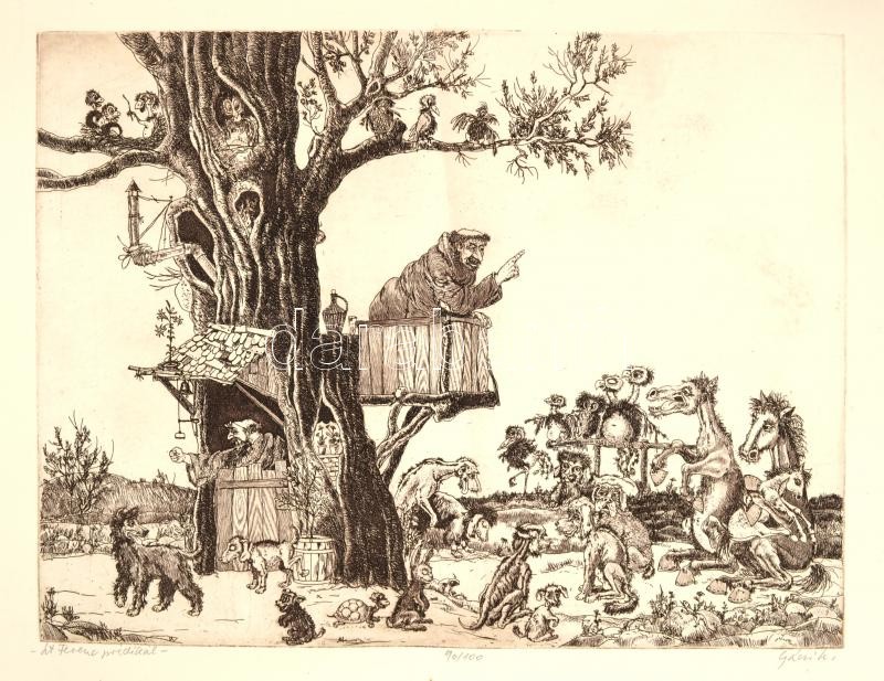Leírás: Gácsi Mihály (1926-1987): Szent Ferenc prédikál. Rézkarc, papír, jelzett, felcsavarva, kis szakadásokkal, 29×38 cm