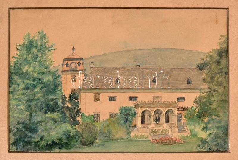 Leírás: Gimányik jelzéssel: Kastély. Akvarell, papír, apró foltokkal, 16×24 cm
