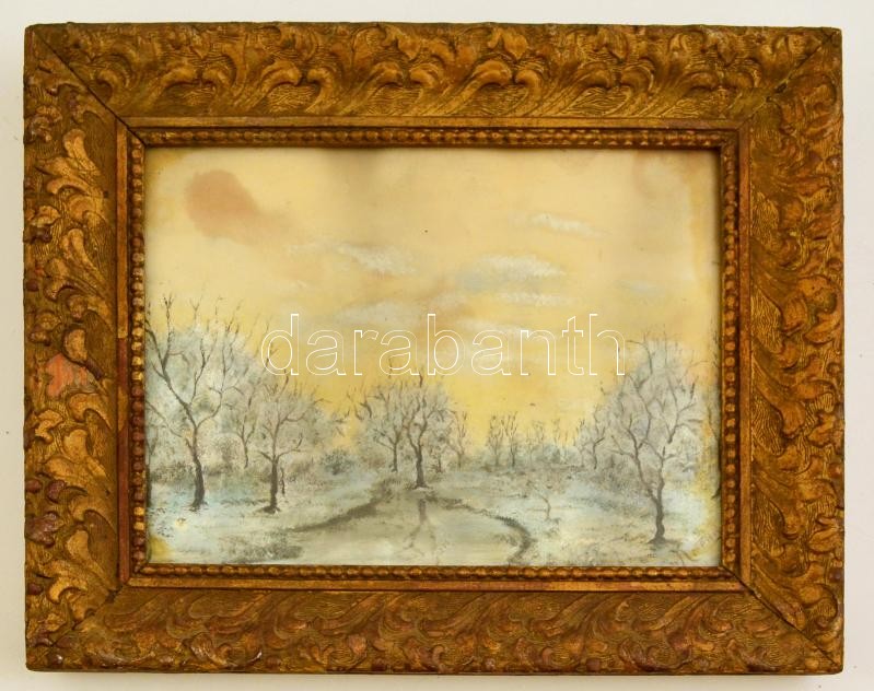 Leírás: Katona jelzéssel: Téli napsütés, vegyes technika, papír, foltos, üvegezett fa keretben, 19,5×25 cm