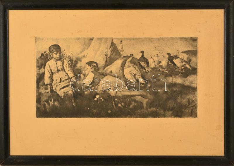 Leírás: Magyar Mannheimer Gusztáv (1859-1937) - Prihoda István (1891-1956): Gyöngytyúkokra vigyázó gyerekek. Rézkarc, papír, jelzett, keretben, 23,5×46 cm