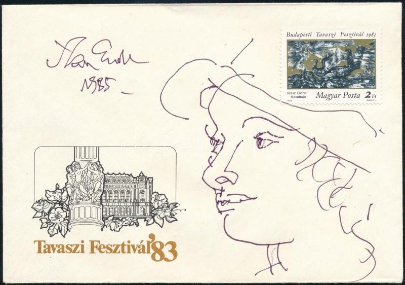 Leírás: Szász Endre (1927-2003) saját kezű tollrajza és aláírása a Budapesti Tavaszi Fesztivál borítékjánaz általa tervezett bélyeggel.