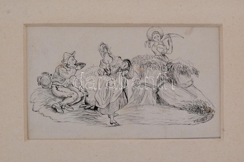 Leírás: V.S. jelzéssel: Ebédidő 1863. Tus, papír, 8,5×15 cm