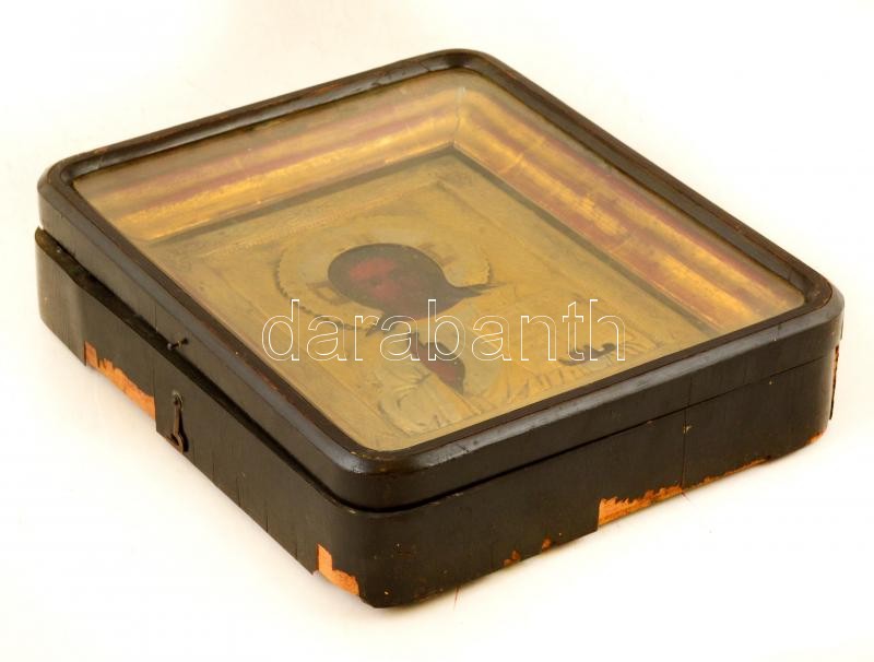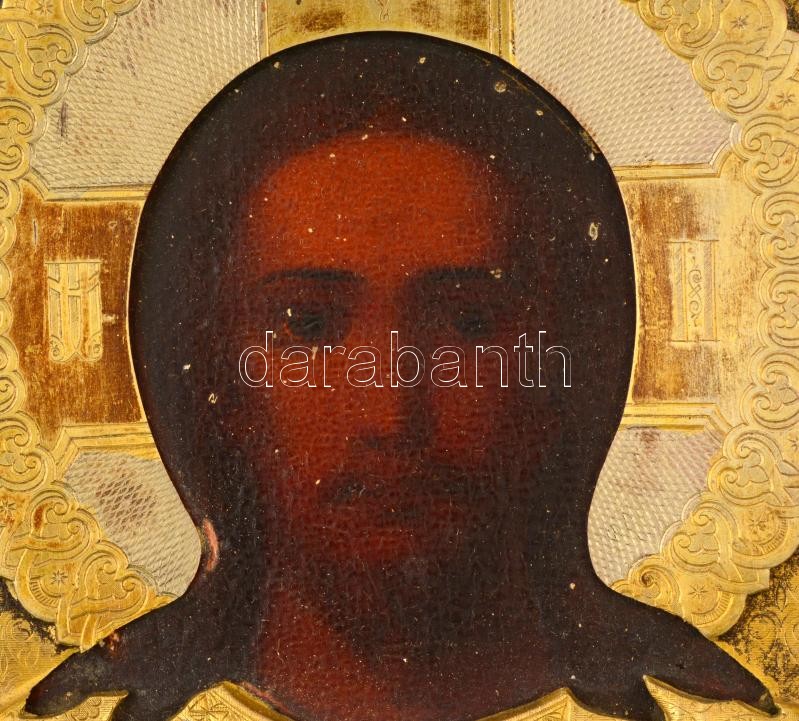 cca 1900 Tanító Krisztus ikon,réz okláddal (hibás), olaj (erősen besötétült)), fatábla (törött), kopott apró horpadásokkal hibás keretben és üvegezett tokban, jelzés nélkül, 22×18 cm