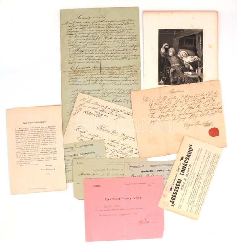 Leírás: 1785-1900 Vegyes okmány és irat tétel: Két viaszpecsétes irat, házassági szerződés, 7 db háború előtti orvosi irat, acélmetszet.