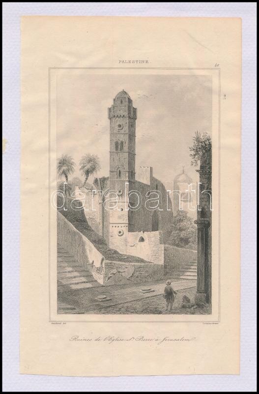 cca 1845 Ruines de l'église Saint Pierre a Jerusalem, acélmetszet Salomon Munk "Palestine. Description géographique, historique et archéologique" című munkájából (Párizs, 1845), kartonra ragasztva, 12,5×21 cm