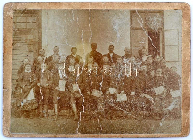 Leírás: 1900 Szölgyén, tanítók csoportképe, keményhátú fotó, sérülésekkel, 8,5×12 cm