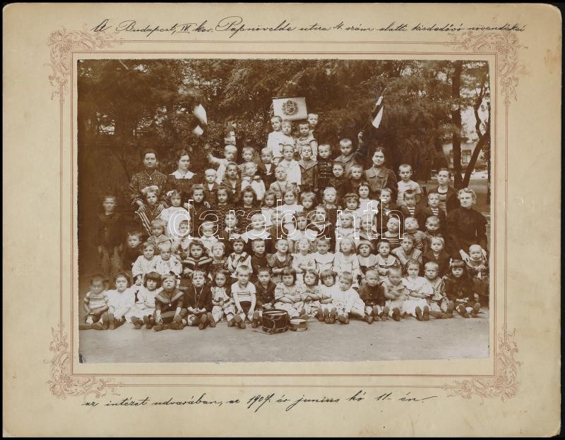 1907 Bp., Papnövelde utcai kisdedóvó növendékei az intézet udvarán, ta... https://www.darabanth.com/hu/361-Gyorsarveres/361.0/Fotomuveszet/Foto~500023/1907-Bp-Papnovelde-utcai-kisdedovo-novendekei-az-intezet-udvaran-tablofoto-foto-karton~II1992214