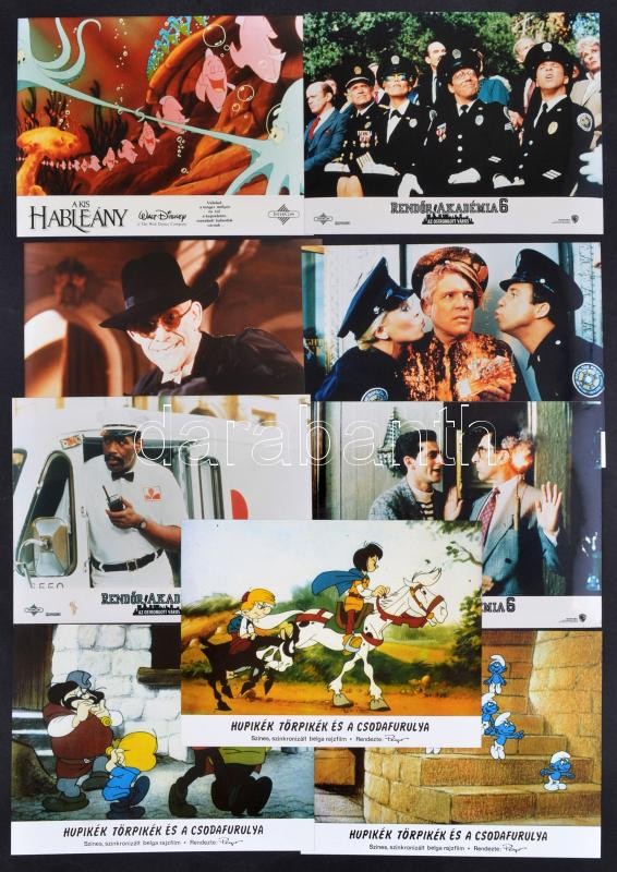 1976-1989 Vegyes werkfotó tétel, 9 db, Rendőrakadémia 6 (4 db), Hupikék törpikék és a csodafurulya (2 db), Roger Nyúl a pácban, A kis hableány, 18x24 cm