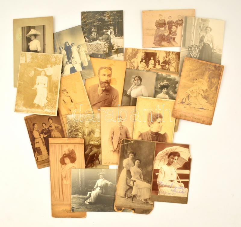 cca 1900-1910 Vegyes fotó tétel, portré fotók és csoportképek, 20 db, keményhátú fotó, fotó kartonon, változó állapotban, közte sérültek23x10 cm és 10x15 cm közötti méretben