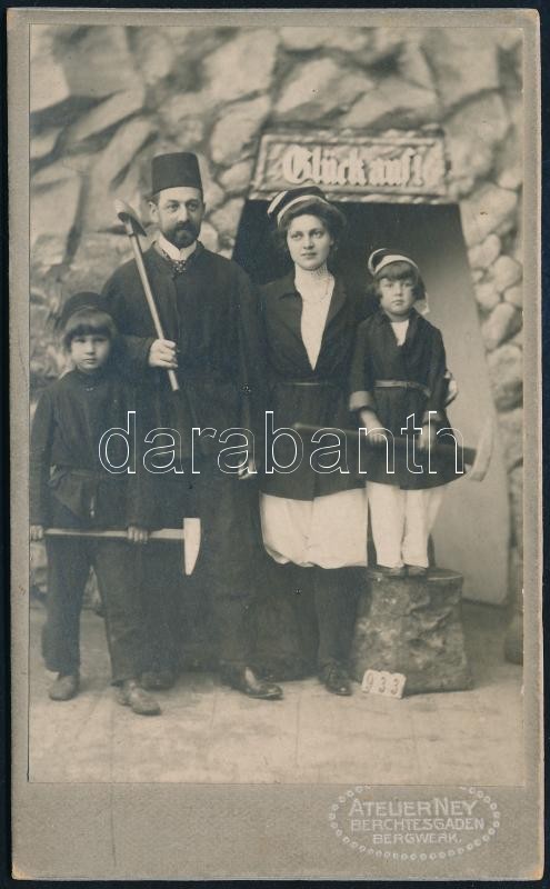 cca 1910 Vámbéry Rusztem (1872-1948) polgári radikális publicista, Vámbéry Ármin orientalista fia családjával a berchtesgadeni bányánál, keményhátú fotó, feliratozva, 10×6 cm