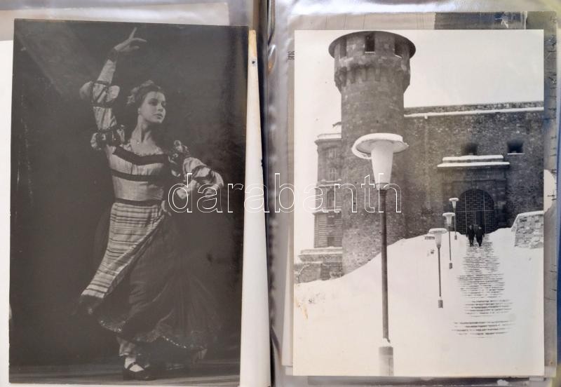 cca 1930-1970 Vegyes fotó tétel: magyar és külföldi városok (Buzogánytorony, stb.), színházi előadások képei, stb., étlap mappába kötve, összesen 12 db, különböző méretben