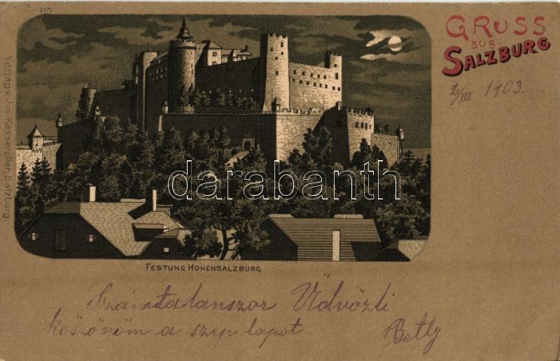 Leírás: 1903 Salzburg, Festung Hohensalzburg / castle at night. Verlag v. Jos. Kasseroller 2171. Art Nouveau, litho (EK)