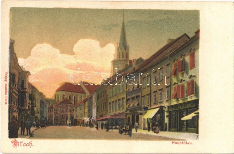 Leírás: Villach, Hauptplatz. Verlag Mathias Fürst / main square, shop of Mathias Fürst