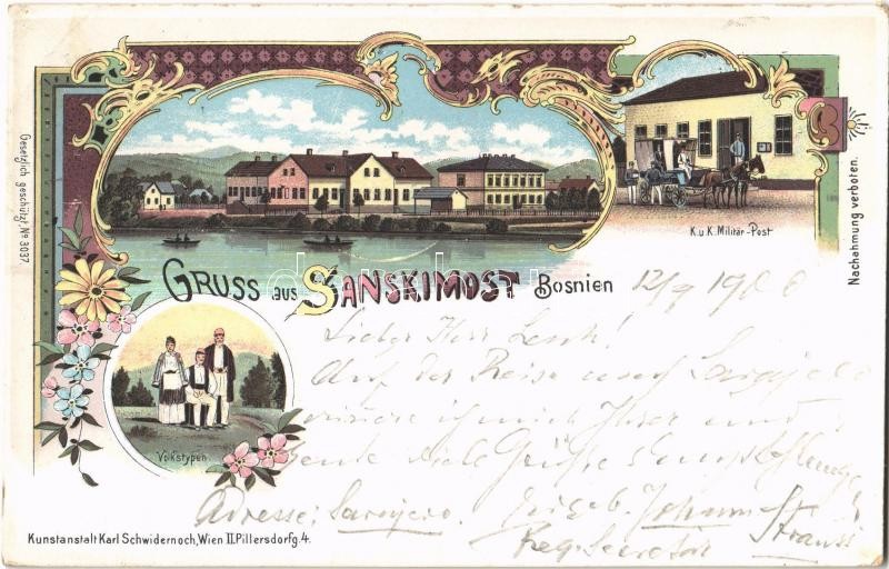 1900 Sanski Most, Sanskimost; Volkstypen, K.u.k. Militär Post / folklore, Austro-Hungarian military post office, horse cart. Kunstanstalt Karl Schwidernoch Art Nouveau, floral, litho
