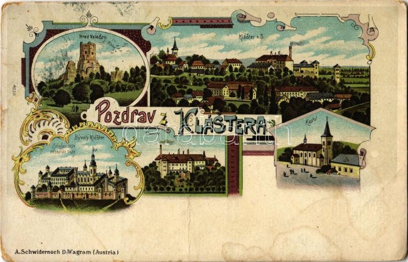 Leírás: Kláster, Hrad Valecov, Kostel, Pivovar, Byvaly Kláster / Kláster Hradiste nad Jizerou, Mnichovo Hradiste, castle, brewery, church. A. Schwidernoch Art Nouveau, floral, litho (Rb)