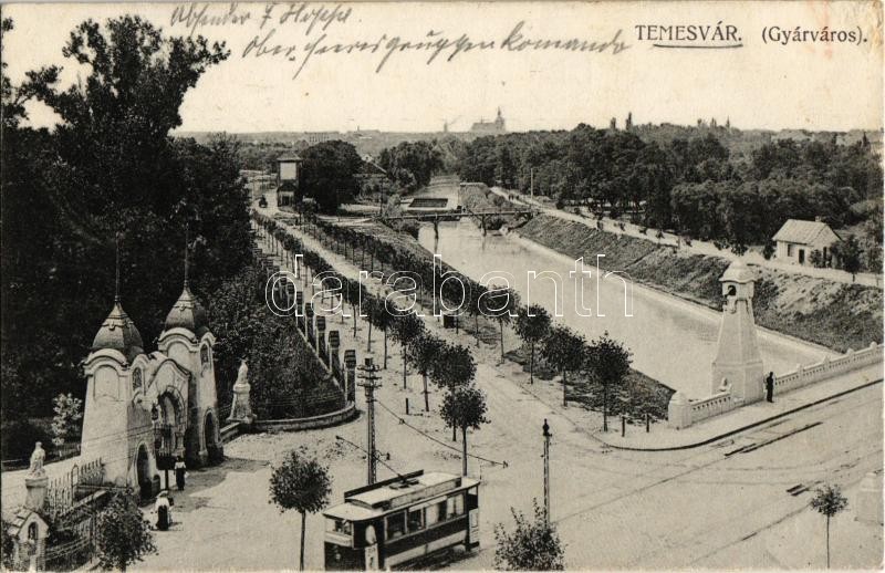 1915 Temesvár, Timisoara; Gyárváros, liget bejárata, villamos, híd / Fabrica, tram, bridge, entry gate to the park + "K.D. Feldpostexp. Oberkommandos der 11. Armee"