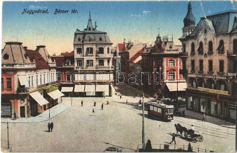 Leírás: 1917 Nagyvárad, Oradea; Bémer tér, Erdős és Grünfeld áruháza, Markovits és Weinberger üzlete, Duna biztosító, villamos / square, shops, store, insurance company, tram (b)