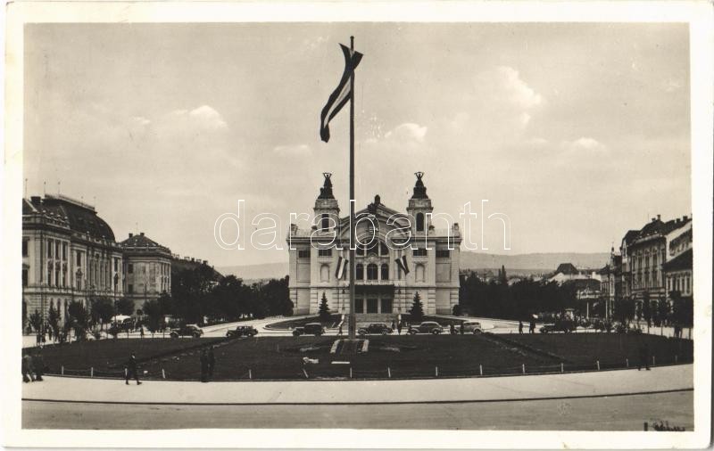 Leírás: Kolozsvár, Cluj; Hitler Adolf tér, színház magyar címerrel és zászlókkal, országzászló / square, theatre with Hungarian coat of arms and flags