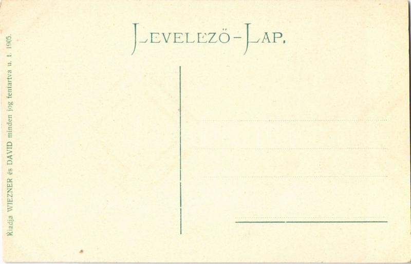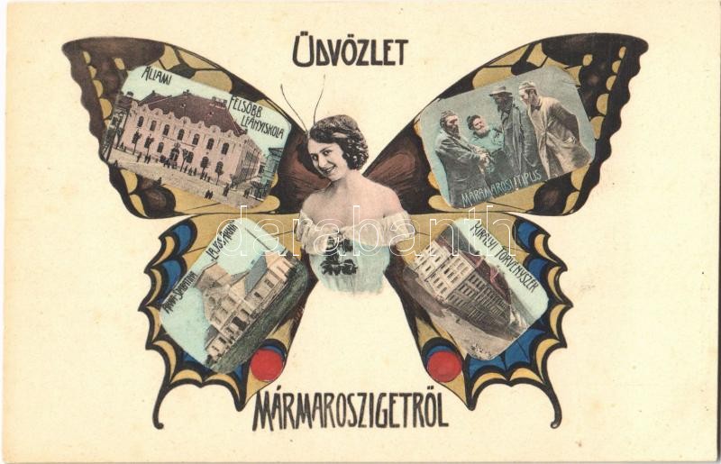 Máramarossziget, Mármarossziget, Sighetu Marmatiei; Zsidó típusok, állami felsőbb leányiskola, Királyi törvényszék, Lajos akna. Pillangós hölgy szecessziós üdvözlő montázslap. Wiezner és Dávid kiadása / Jewish types, Judaica, girl school, court, mine shaft. Butterfly lady Art Nouveau montage greeting art postcard