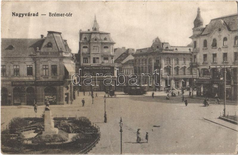Leírás: Nagyvárad, Oradea; Brémer tér, Erdős Emil, Dumbera István és Berger Sándor üzlete, villamos / square, shops, tram (kis szakadás / small tear)