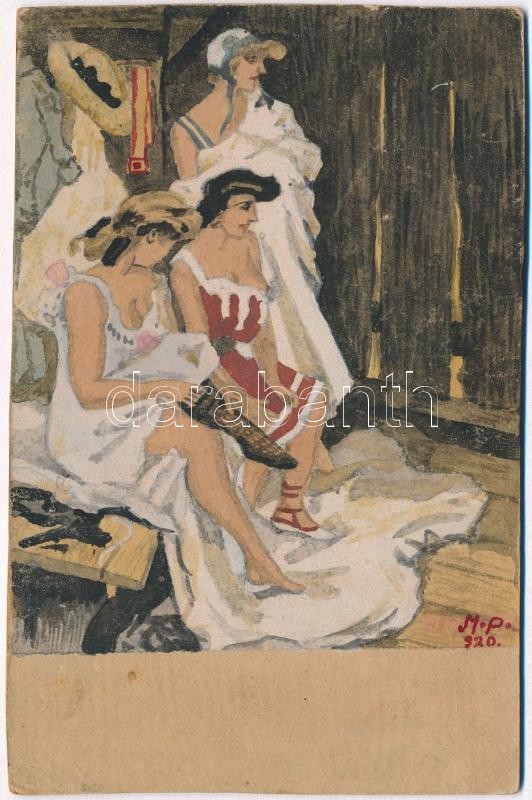 Leírás: Hölgyek az öltözőben. Kézzel készített enyhén erotikus művészlap / Ladies in the dressing room. Handmade slightly erotic art postcard. s: M. P.