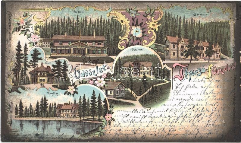 Leírás: 1903 Thurzófüred, Kupele Turzo (Gölnicbánya, Gelnica); Vendéglő, fürdő, Budapest, Bányász és Thurzóház villák / restaurant, villas, spa. Art Nouveau, floral, litho (EK)