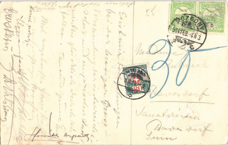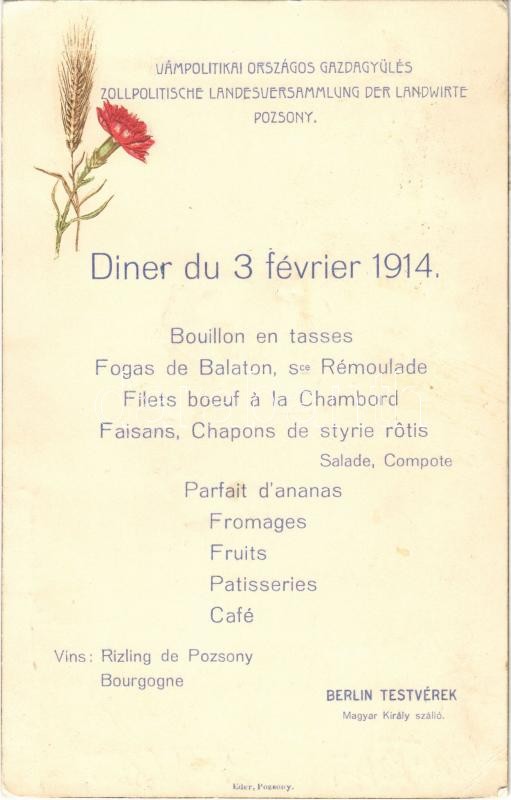 1914 Pozsony, Pressburg, Bratislava; Vámpolitikai Országos Gazdagyűlés. Vacsora menü a Berlin Testvérek magyar Király szállójában / Zollpolitische Landesversammlung der Landwirte / National Customs Policy Meeting. Dinner menu card, Emb. (17,3 x 11 cm) (EK)