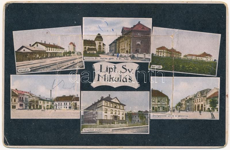 Leírás: Liptószentmiklós, Liptovsky Mikulás; laktanya, vasútállomás, reál gimnázium, Pénzügyigazgatóság, Stefánik utca és tér / military barracks, railway station, grammar school, financial directorate, street, square (hiányos leporelló / missing leporello)