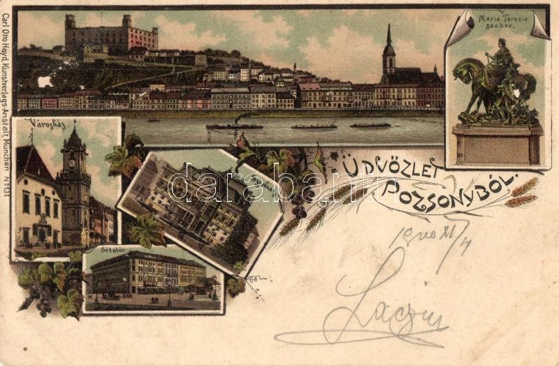Pozsony, Pressburg, Bratislava; Városház, Mária Terézia szobor, színház, sétatér / town hall, monument, theatre, promenade. Carl Otto Hayd Art Nouveau, floral, litho (ázott / wet damage)