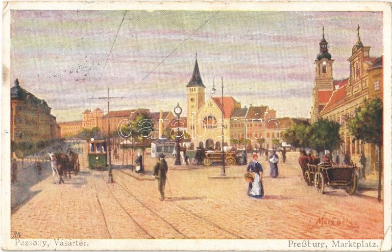 Leírás: Pozsony, Pressburg, Bratislava; Vásár tér, villamos / Marktplatz / market square, tram. B.K.W.I. 389-14. s: Marx Béla (EK)