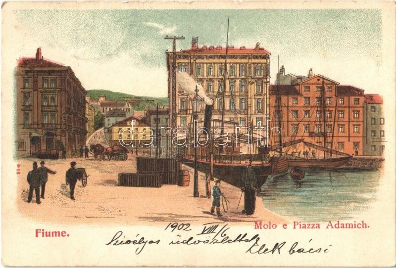 1902 Fiume, Rijeka; Molo e Piazza Adamich. litho (EK) https://www.darabanth.com/hu/361-Gyorsarveres/361.0/Kepeslapok/Horvatorszag~1500010/1902-Fiume-Rijeka-Molo-e-Piazza-Adamich-litho-EK~II2082726