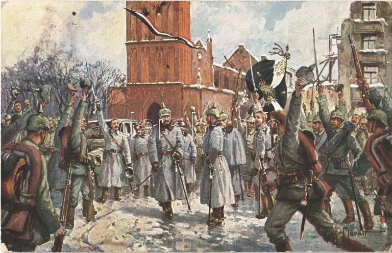 Der Kaiser inmitten seiner Truppen auf dem Marktplatz in Lyck / Wilhelm II with his soldiers in Elk (Poland). WWI German military art postcard. A.R. & C.i.B. No. 790. artist signed