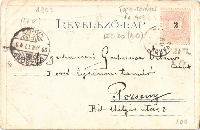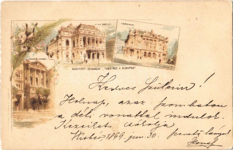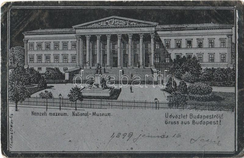 1899 Budapest - 2 db régi szecessziós lap: Nemzeti múzeum (ezüstös fóliás képeslap), Budapesti színházak / 2 Art Nouveau postcards from 1899 (one with metallic foil)