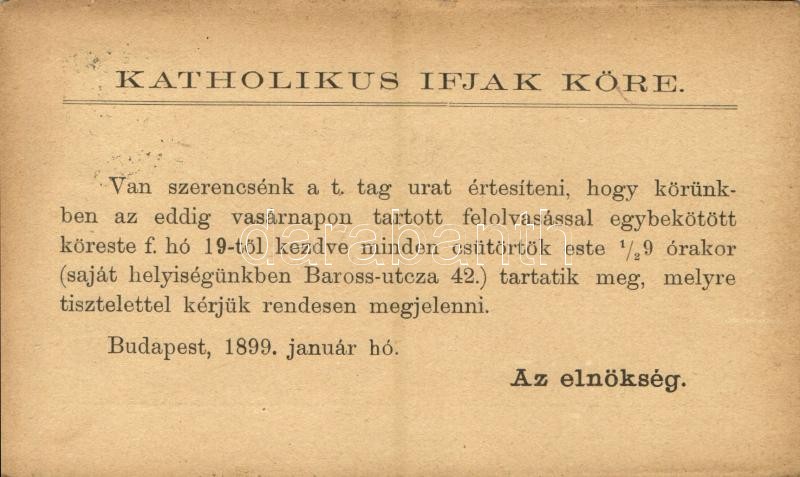 1899 Budapest VIII. Katolikus Ifjak Köre lapja a felolvasó körestről. ... https://www.darabanth.com/hu/361-Gyorsarveres/361.0/Kepeslapok/Magyarorszag~1500006/1899-Budapest-VIII-Katolikus-Ifjak-Kore-lapja-a-felolvaso-korestrol-Baross-utca-42-EM~II2061040