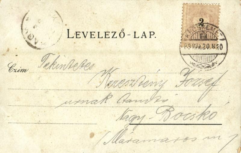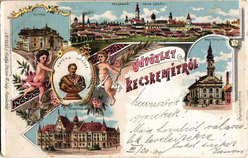 Leírás: 1899 Kecskemét, színház, nagytemplom, új városháza, Katona József mellszobra. Steiner Mihály kiadása. Art Nouveau, floral, litho