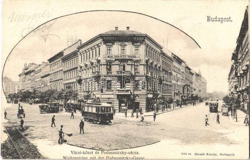 1907 Budapest VI. Váci körút, Podmaniczky utca, villamosok, Weiss és Társa Betéti Társaság, Teutsch B. József erdélyi borai, csendőr, utcaseprő. Divald Károly m246.