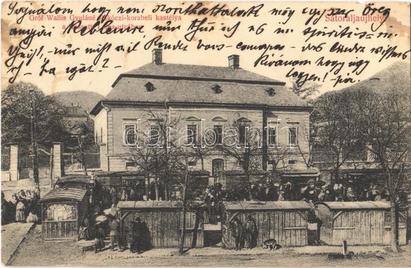 Leírás: 1910 Sátoraljaújhely, Gróf Wallis Gyuláné Rákóczi korabeli kastélya a Kossuth Lajos utcában, piac. Lővy Adolf kiadása (kis szakadás / small tear)