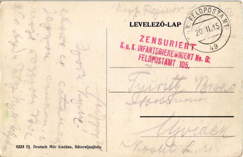 Leírás: 1915 Sátoraljaújhely, M. kir. dohánygyár + "Zensuriert K.u.K. Infanterieregiment No. 6. Feldpostamt 105."