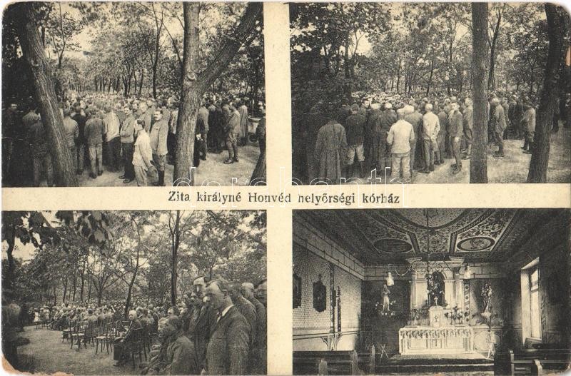 Leírás: 1917 Budapest IX. Zita királyné honvéd helyőrségi kórház, katonák, kápolna, belső. Irgalmas nővérek kiadása (kopott sarkak / worn corners)