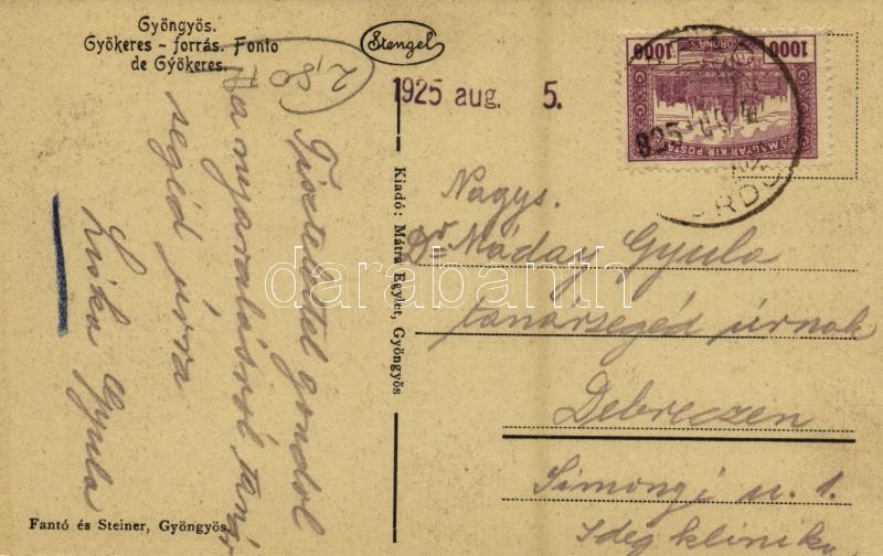 Leírás: 1925 Gyöngyös, Gyökeres-forrás. Fantó és Steiner