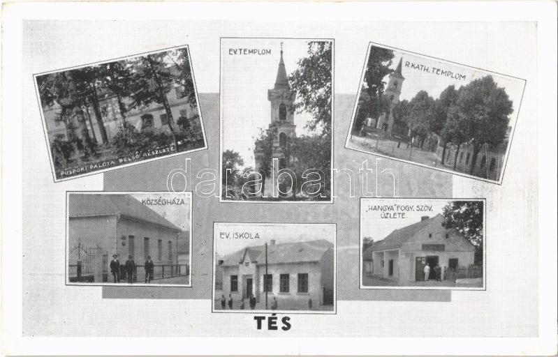 Leírás: 1938 Tés, Evangélikus templom és iskola, római katolikus templom, községháza, Püspöki palota, Hangya fogyasztási szövetkezet üzlete