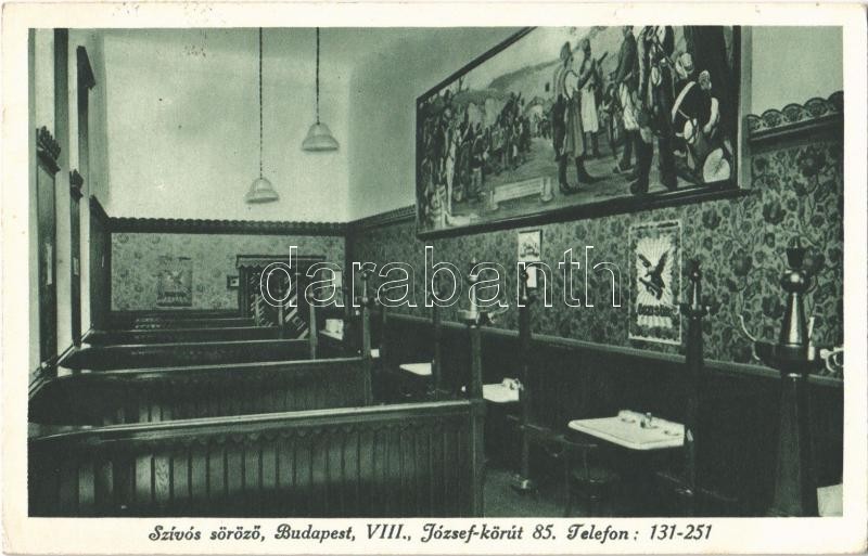 1939 Budapest VIII. Szívós söröző, belső. József körút 85. https://www.darabanth.com/hu/361-Gyorsarveres/361.0/Kepeslapok/Magyarorszag~1500006/1939-Budapest-VIII-Szivos-sorozo-belso-Jozsef-korut-85~II2083985