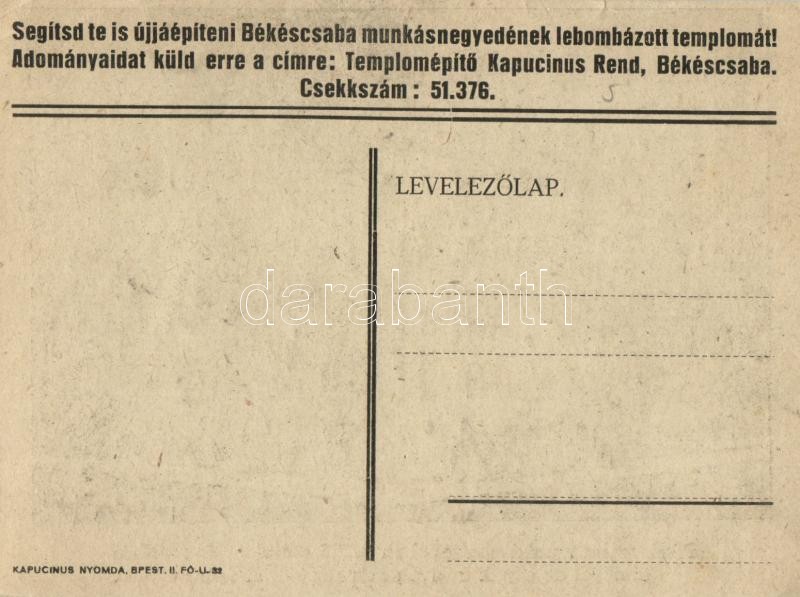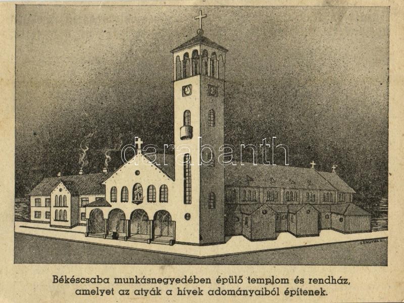 Békéscsaba, Békéscsaba munkásnegyedében épülő templom és rendház, amelyet az atyák a hívek adományaiból építenek. Kapucinus nyomda kiadása s: Lengyel L. (gyűrődés / crease)