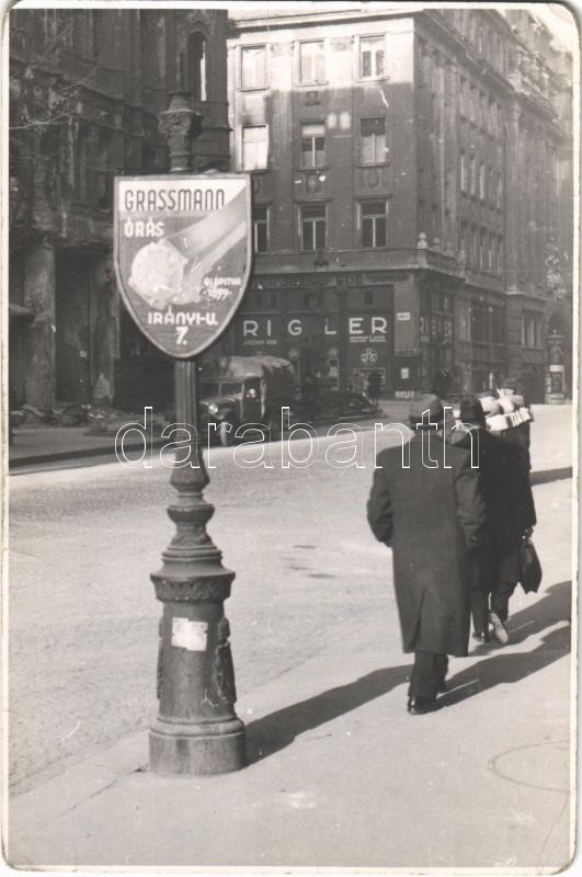 Budapest V. Eskü út (ma Szabad sajtó út), Rigler József Ede Papírnemű gyár részvénytársaság üzlete a sarkon, Grassmann órás (Irányi u. 7.) reklámtáblája, autó. photo (EK)