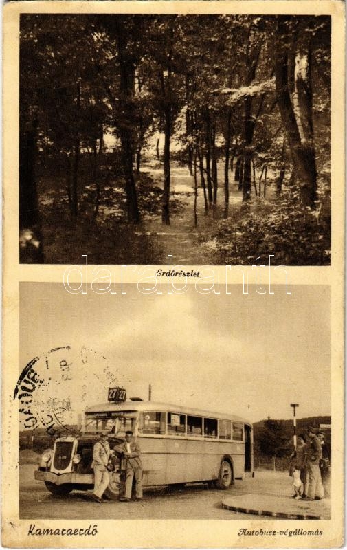 Leírás: Budapest XI. Kamaraerdő, erdő részlet, autóbusz végállomás a 27-es busszal. Hátoldalon Kostyál István "Arany szarvas" vendéglő reklámja