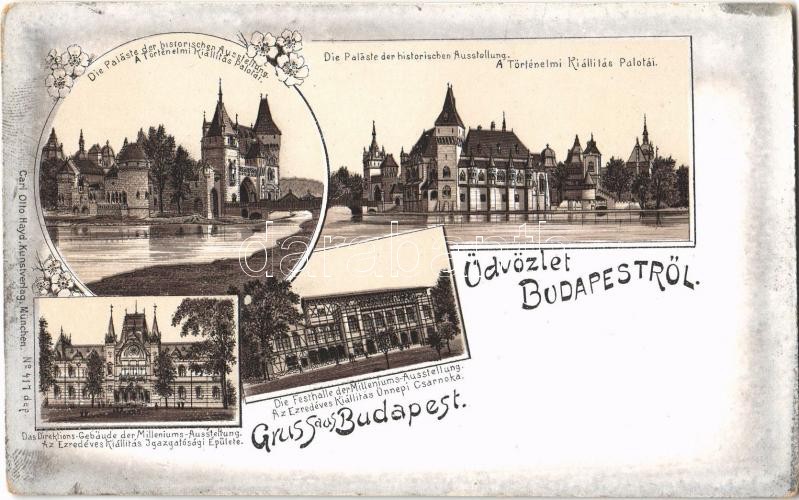 Budapest XIV. Városliget, Ezredéves Országos Kiállítás, Történelmi kiállítás palotái, Vajdahunyad vára, az Ezredéves Kiállítás igazgatósági épülete és az ünnepi csarnoka. Carl Otto Hayd Kunstverlags-Anstalt No. 417. Art Nouveau, floral, litho