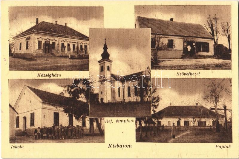 Leírás: Kisbajom, Községháza, Református templom, paplak, iskola, Szövetkezet üzlete