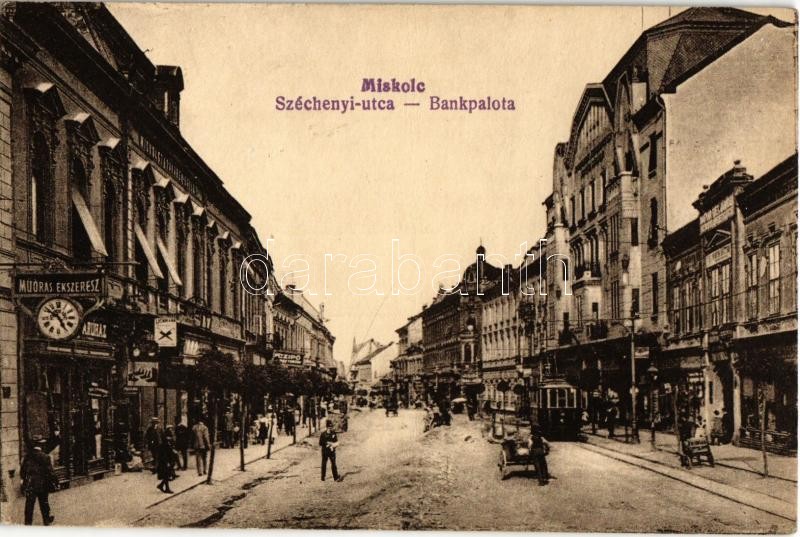 Leírás: Miskolc, Széchenyi utca, bérpalota, villamos, műórás és ékszerész, takarékpénztár, üzletek