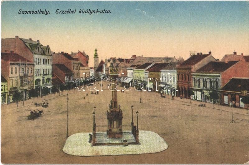 Szombathely, Erzsébet királyné utca, Szentháromság szobor, üzletek https://www.darabanth.com/hu/361-Gyorsarveres/361.0/Kepeslapok/Magyarorszag~1500006/Szombathely-Erzsebet-kiralyne-utca-Szentharomsag-szobor-uzletek~II2079227